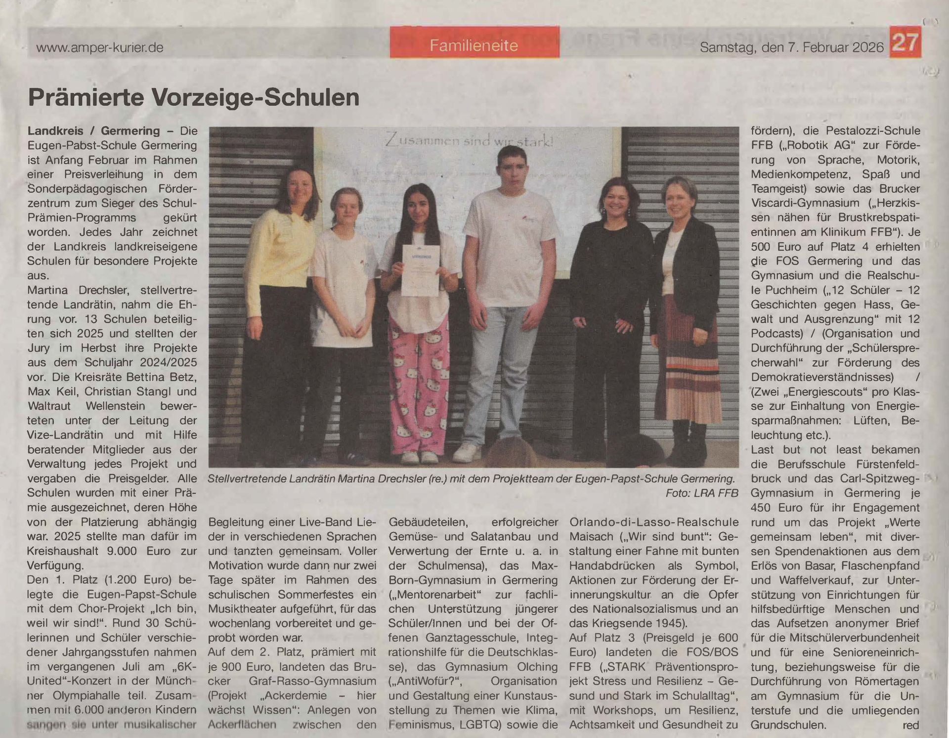 Mit dem Musiktheater „Zusammen sind wir stark“ hat die Eugen-Papst-Schule den Wettbewerb der landkreiseigenen Schulen des Schuljahres 2024/2025 gewonnen.