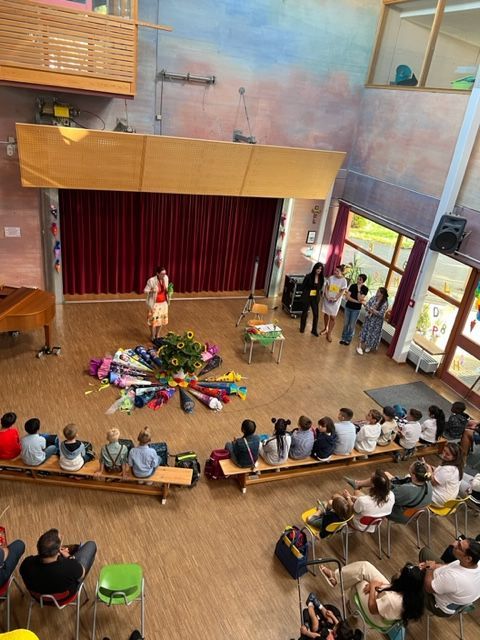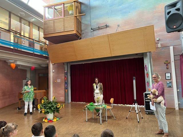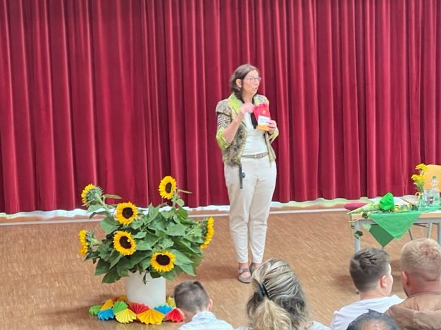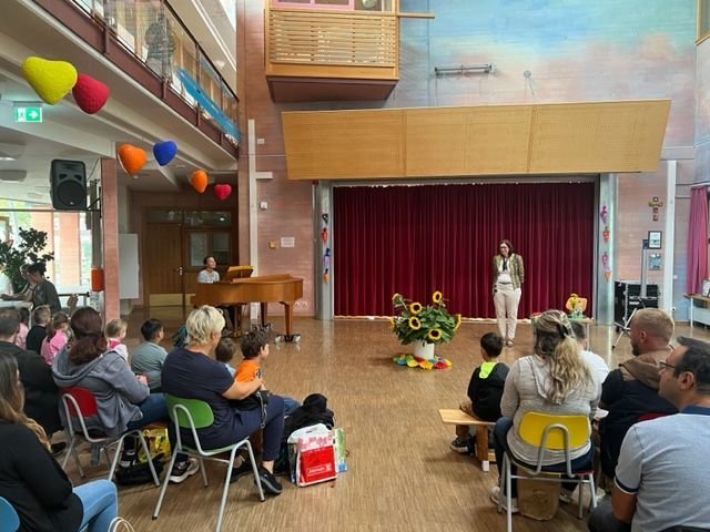 Frau Schleske, die Schulleiterin, begrüßte alle mit einer kleinen Rede. Dabei bekamen die Kinder ein Schulstarterpaket, gefüllt mit einem Bleistift, Radiergummi, einem kleinen Schulregeln-Booklet und etwas Süßem.