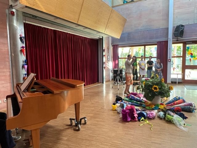 SchülerInnen und Eltern/Großeltern trafen in der Aula der Eugen-Papst-Schule mit ihren selbst gebastelten Schultüten erwartungsvoll ein.