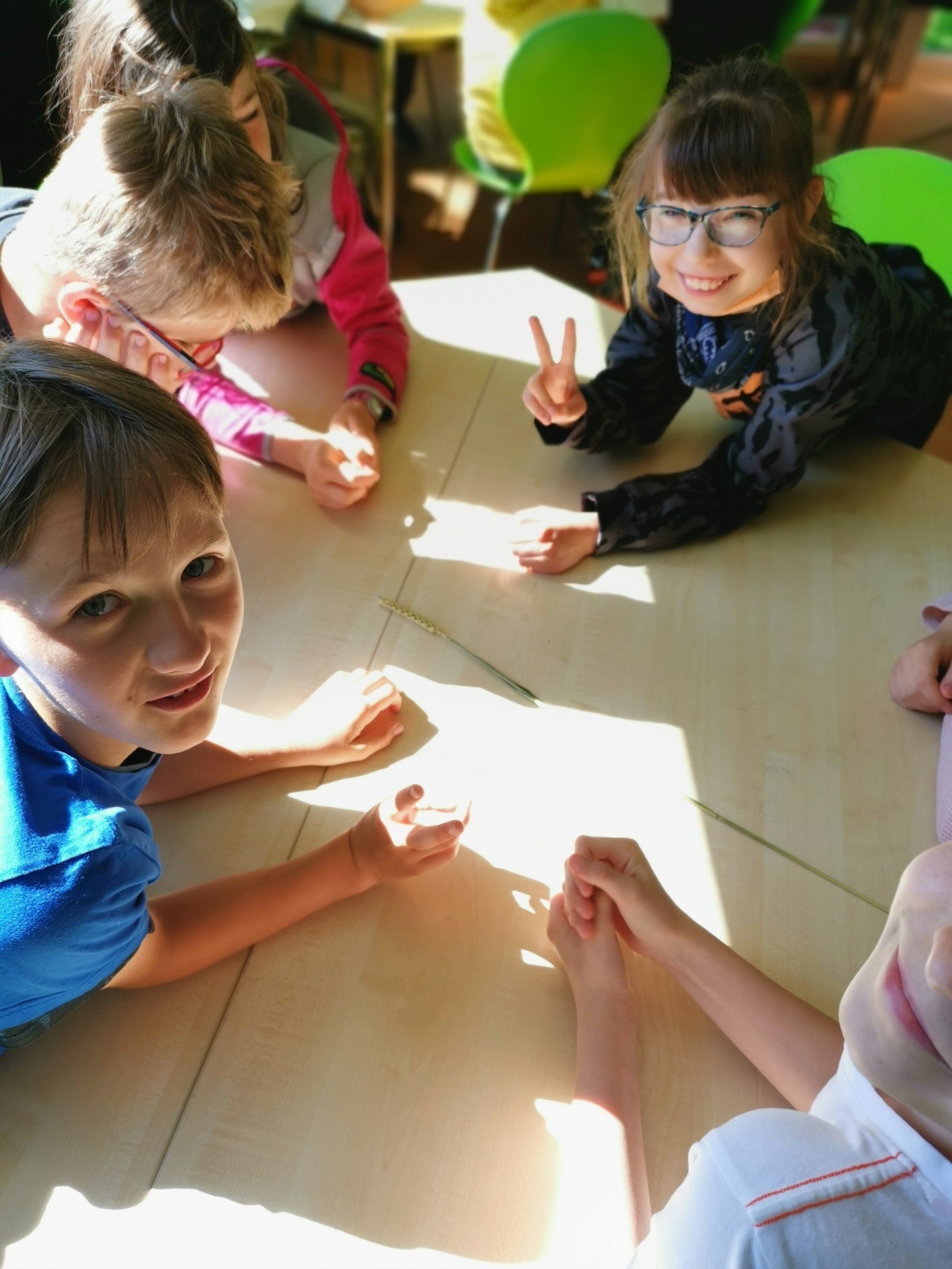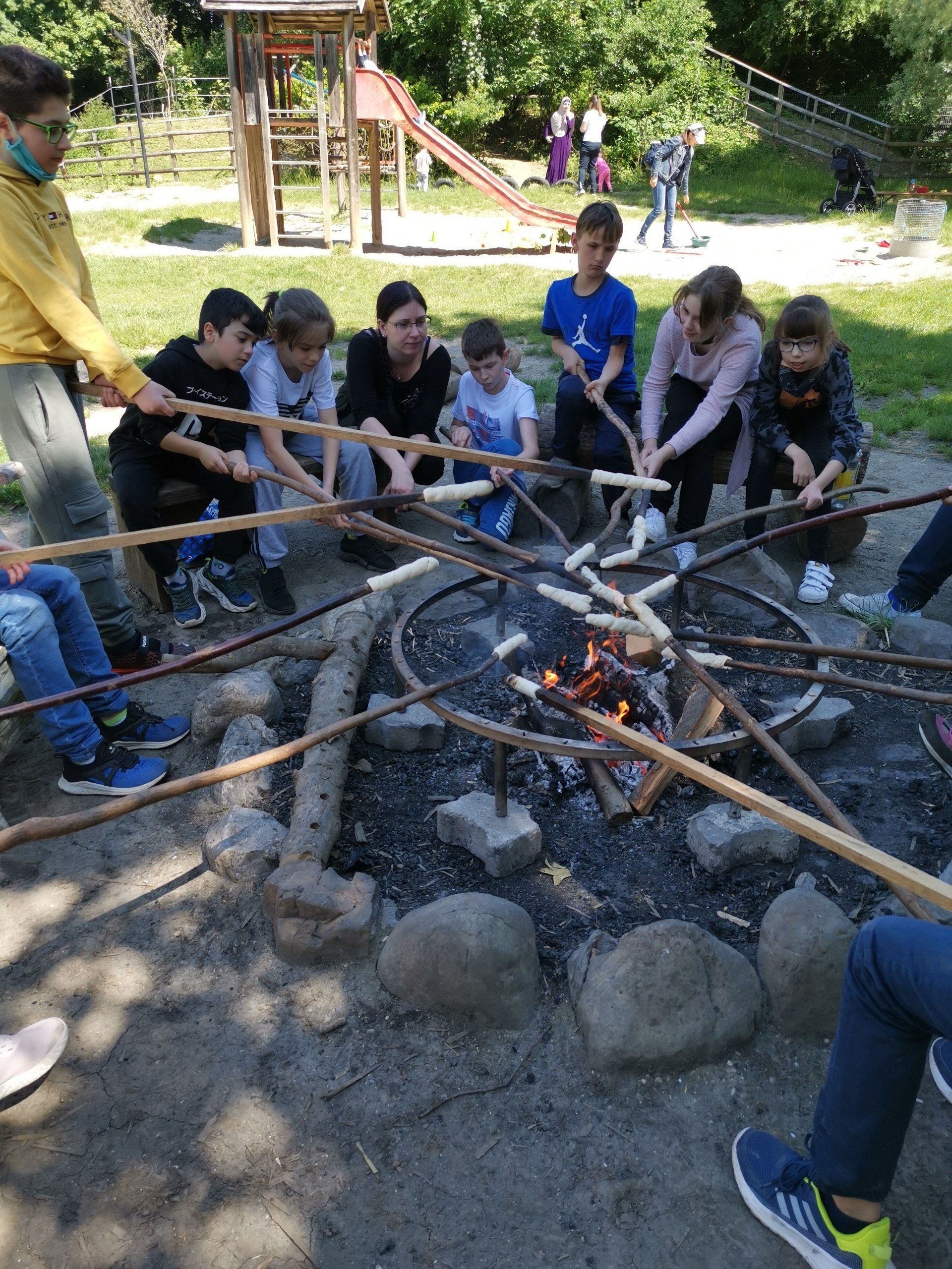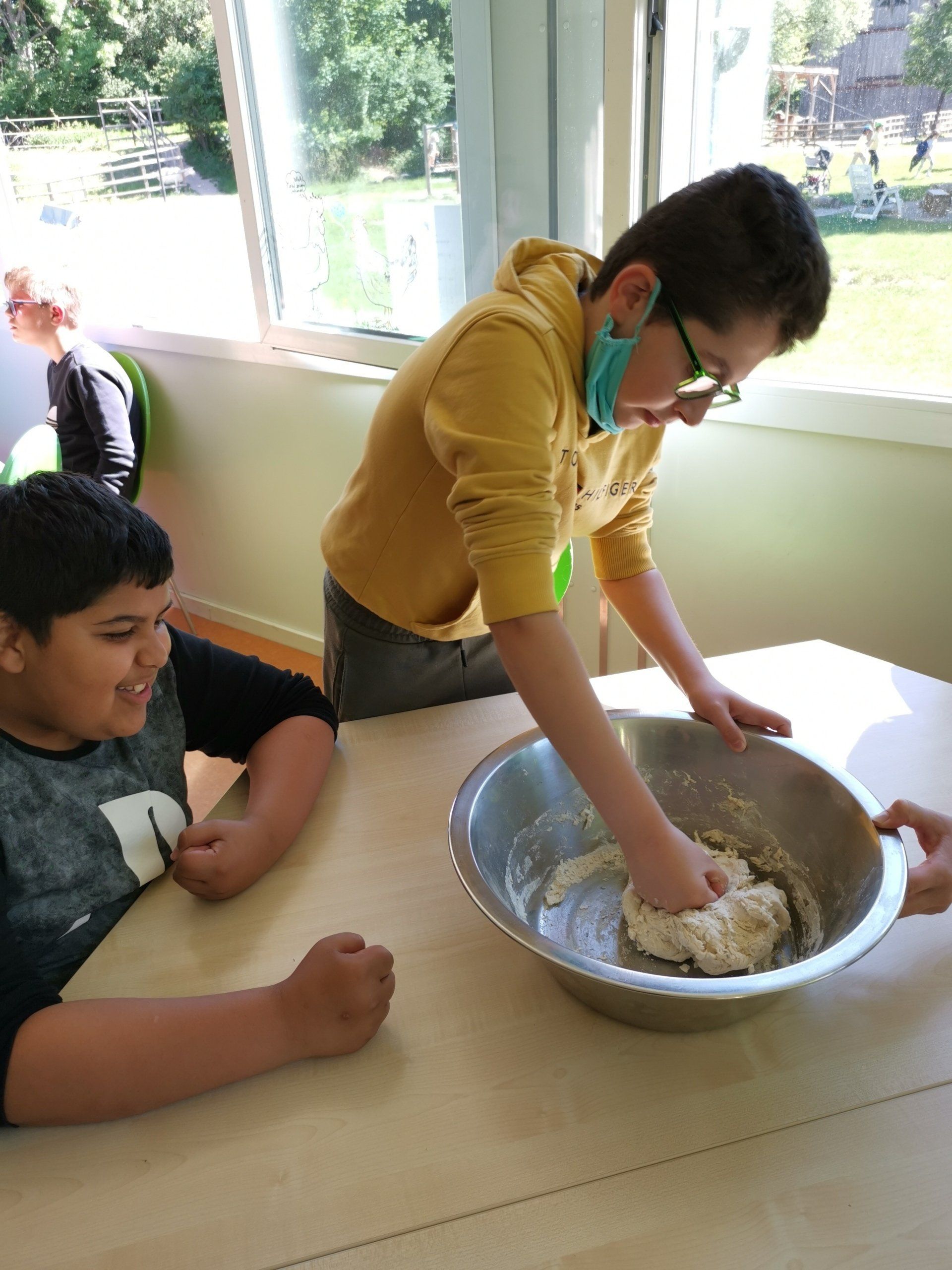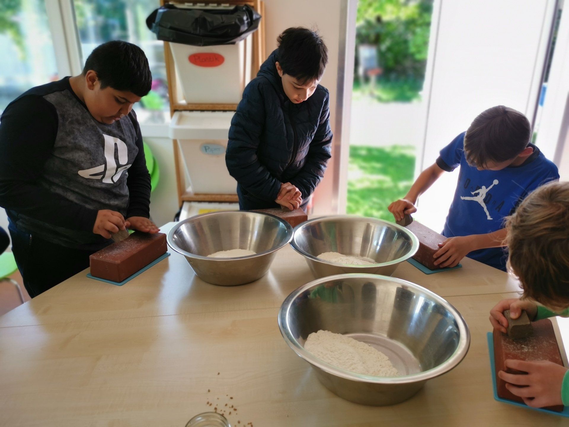 Die Schüler und Schülerinnen beschäftigten sich mit den Zutaten Mehl, Hefe, Salz und Wasser. Dabei durften sie verschiedene Getreidearten unterscheiden und aus Weizenkörnern selbst Mehl mahlen. Gemeinsam wurde Hefeteig vorbereitet und geknetet, der anschließend über dem Lagerfeuer als Stockbrot gebacken wurde.