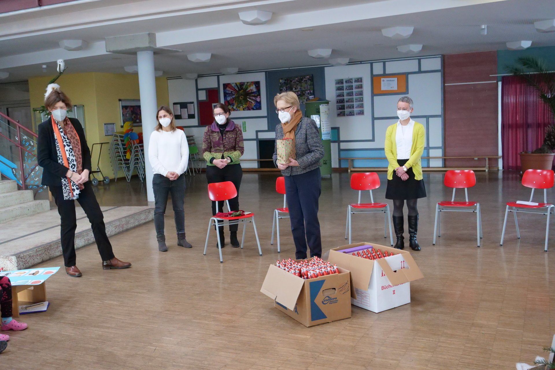 Zum Dank dafür besuchte Frau Regierungspräsidentin Els am 7.12.2021 die Eugen-Papst-Schule. Begrüßt wurden Frau Els und ihre Stellvertreterin Frau Kahle-Sander vom Schulleitungsteam, dem Schülersprecher Catalin und der ersten Klasse mit ihrer Lehrerin Frau Rinscheid. Die Erstklässler präsentierten einen Guten-Morgen-Spruch und ein Schneemann-Gedicht, Catalin überreichte einen Gruß aus der Schulküche.