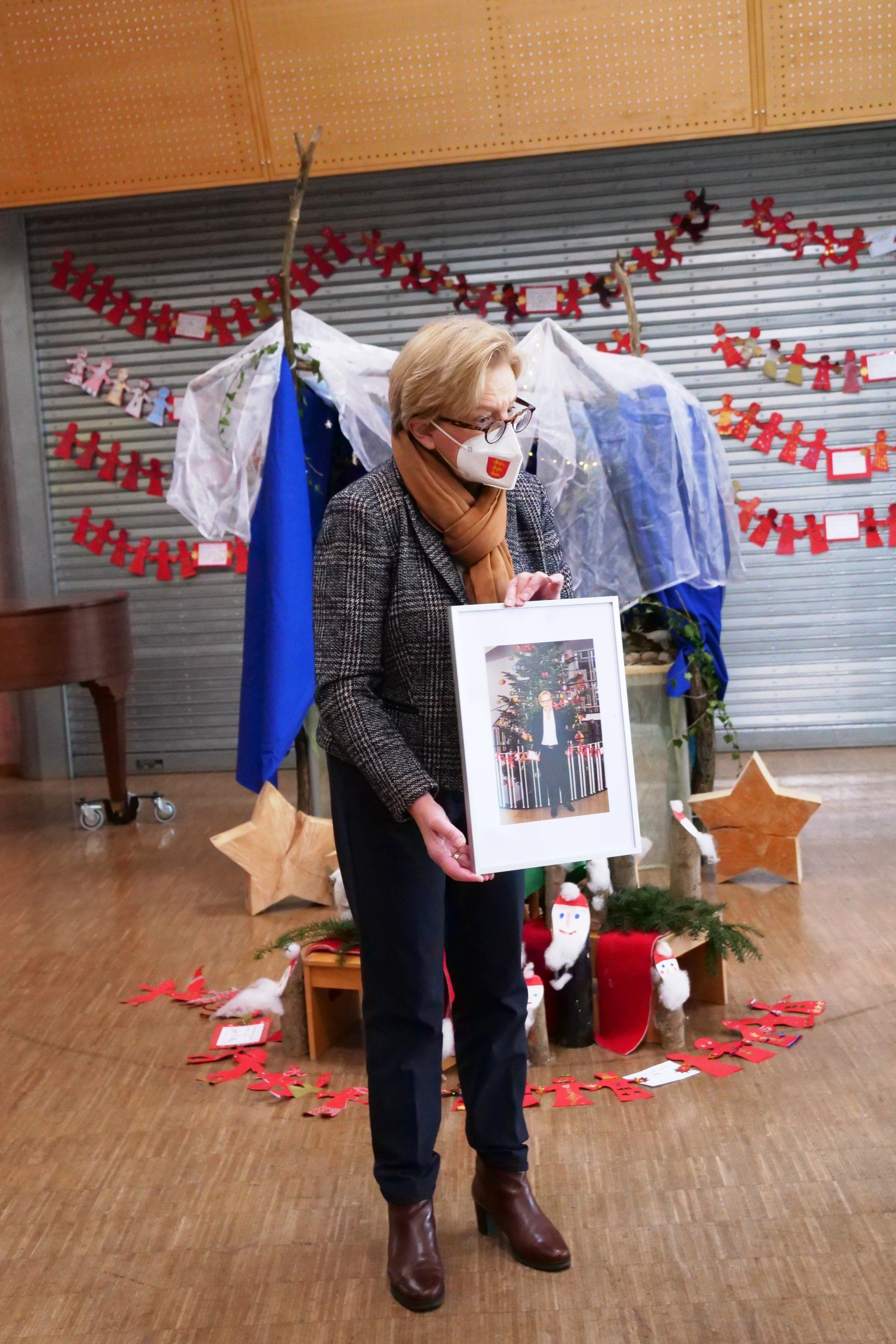 Unter dem Motto „Gemeinsam statt einsam“ entstanden von allen Schülern der Schule gestaltete Christbaum-Girlanden und regenbogenfarbene Kugeln. Der Christbaum in der Eingangshalle des Regierungsgebäudes ist damit farbenfroh und lebendig geschmückt.