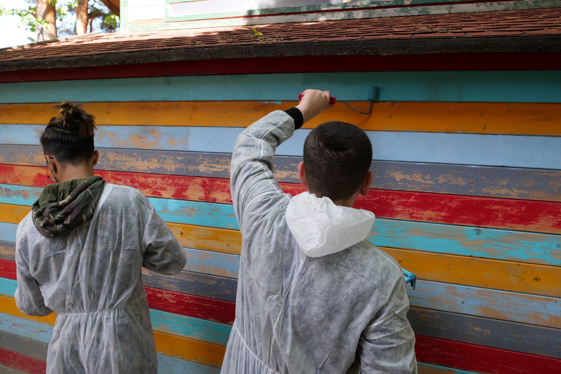 Vor Beginn der kalten Jahreszeit werden die Hütten im großen Pausenhof von Mitarbeitern der Schülerübungsfirma GalaBau unter der Leitung von Frau Angelika Richter mit neuer Farbe versehen.