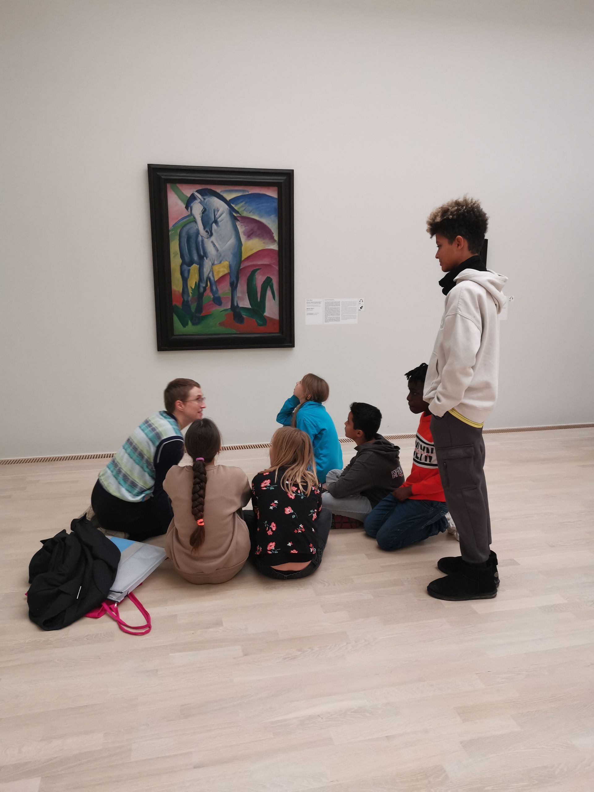 Nachdem wir im Unterricht schon einiges über Franz Marc und die Künstlergruppe „Der Blaue Reiter“ gehört hatten, durften wir nun einige Originalbilder im Museum ansehen. In 2 kleineren Gruppen erzählten uns Expertinnen, was das Besondere an den bunten Tieren und Formen ist.