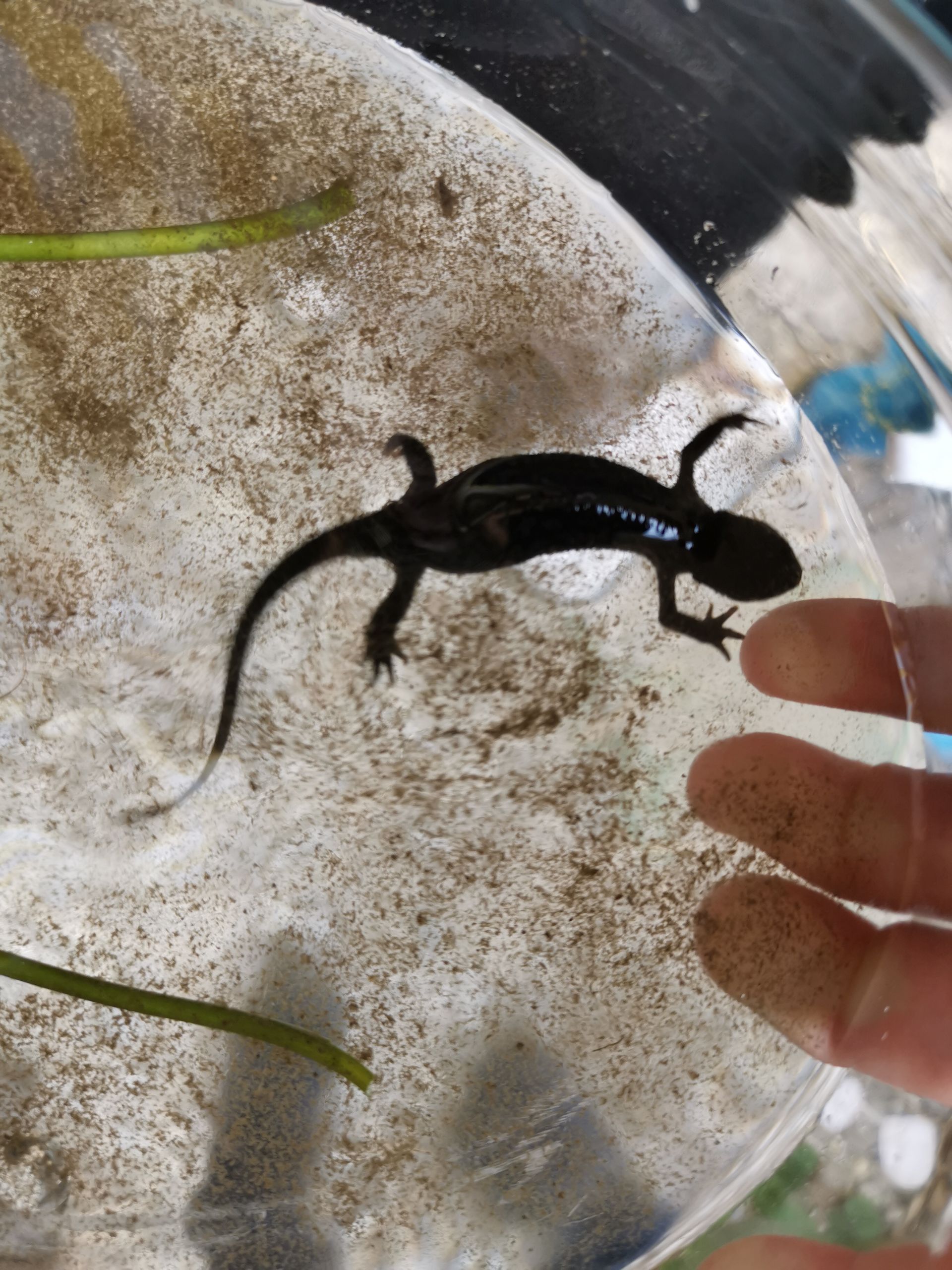 Die Klassen 4a und 4b durften sich hierzu den Schulteich im Wassergarten genauer ansehen. Mit Sieben, Pinseln und Becherlupen ausgerüstet, konnten wir auf Entdeckungsreise gehen. Und wir hätten nie gedacht, dass sich in diesem sehr kleinen Lebensraum so vieles bewegt: Wasserschnecken, Wasserläufer, Libellenlarven und sogar 2 kleine schwarze Molche.