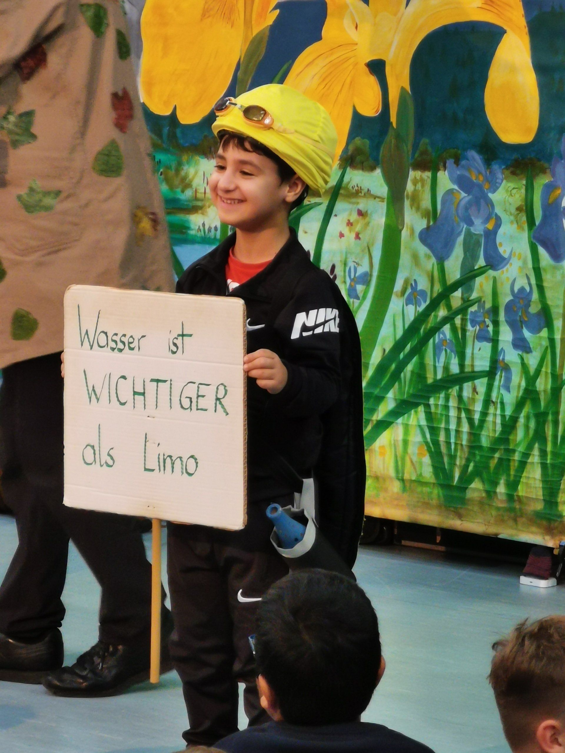 Der Erzähler und Musiker Toni Tanner führte das Stück zusammen mit allen Kindern auf. Einige mutige Schülerinnen und Schüler, die sich freiwillig meldeten, kamen während des Stückes auf die Bühne, wurden verkleidet und spielten unter Anleitung des Erzählers mit.
