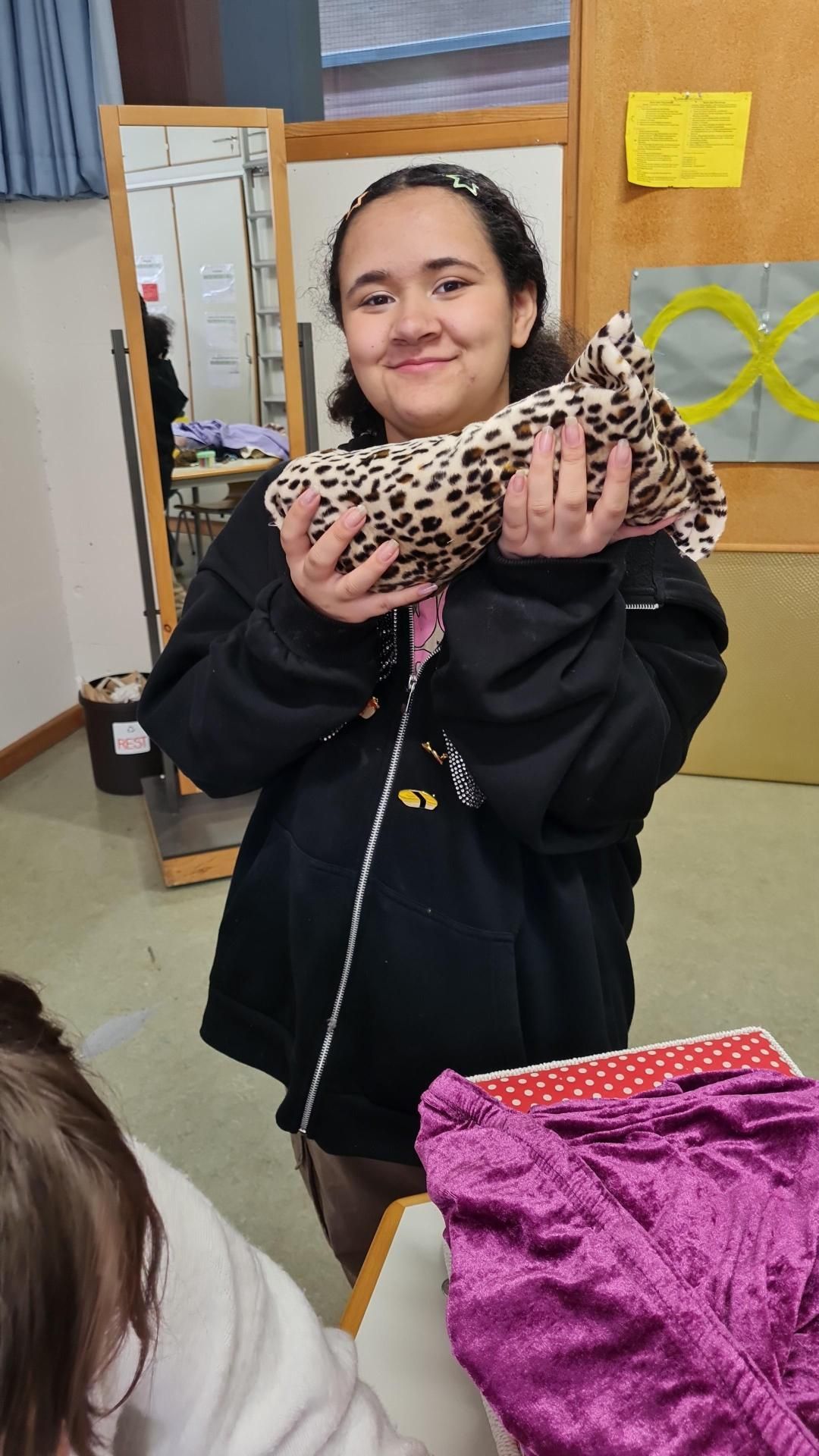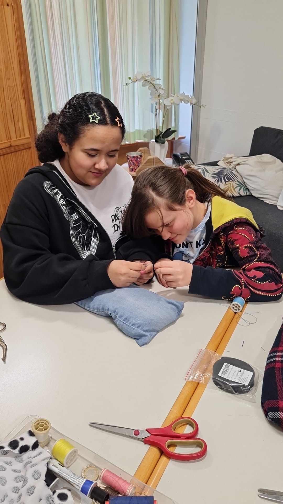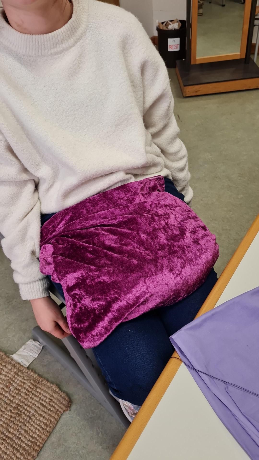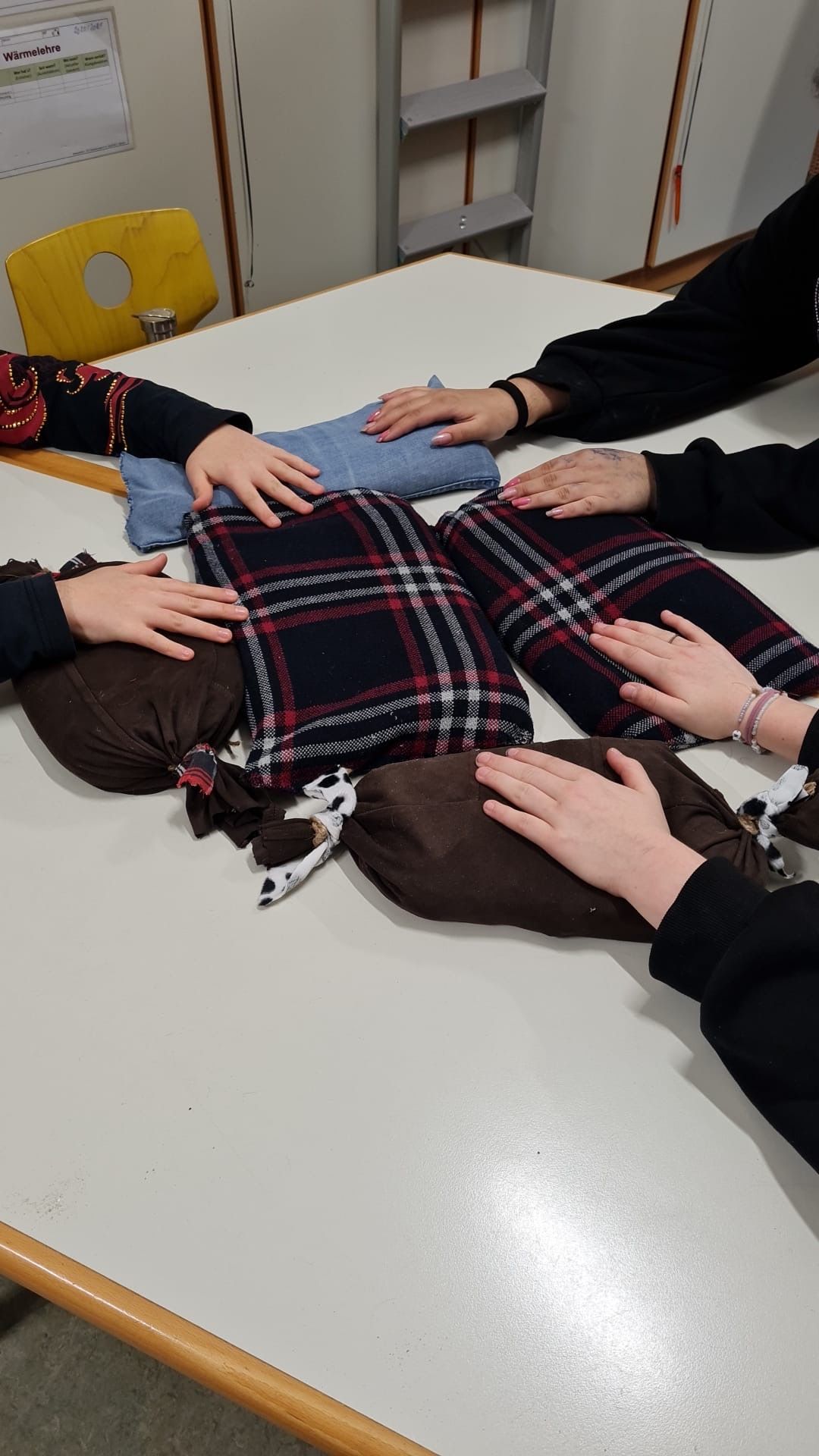 Die Mitarbeiterinnen fertigen kleine Bälle aus Stoffen von aussortierten Hosen, elastische Bänder werden eingeklebt und um eine Tischplatte gespannt. Unruhige Kinder können durch diese elastische Vorrichtung zappelige Bewegungen umlenken.